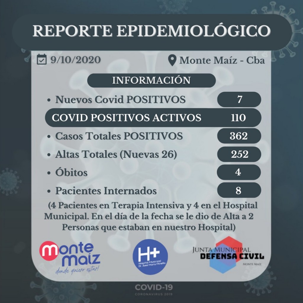 A la fecha, 110 son casos activos, 252 superaron la enfermedad y 4 fallecieron. Hay 8 pacientes que están internados: 4 están en terapia intensiva y 4 están en el Hospital Municipal. Así mismo, en el día de hoy se les dio el alta a 2 pacientes que estaban internados en el Nosocomio local.