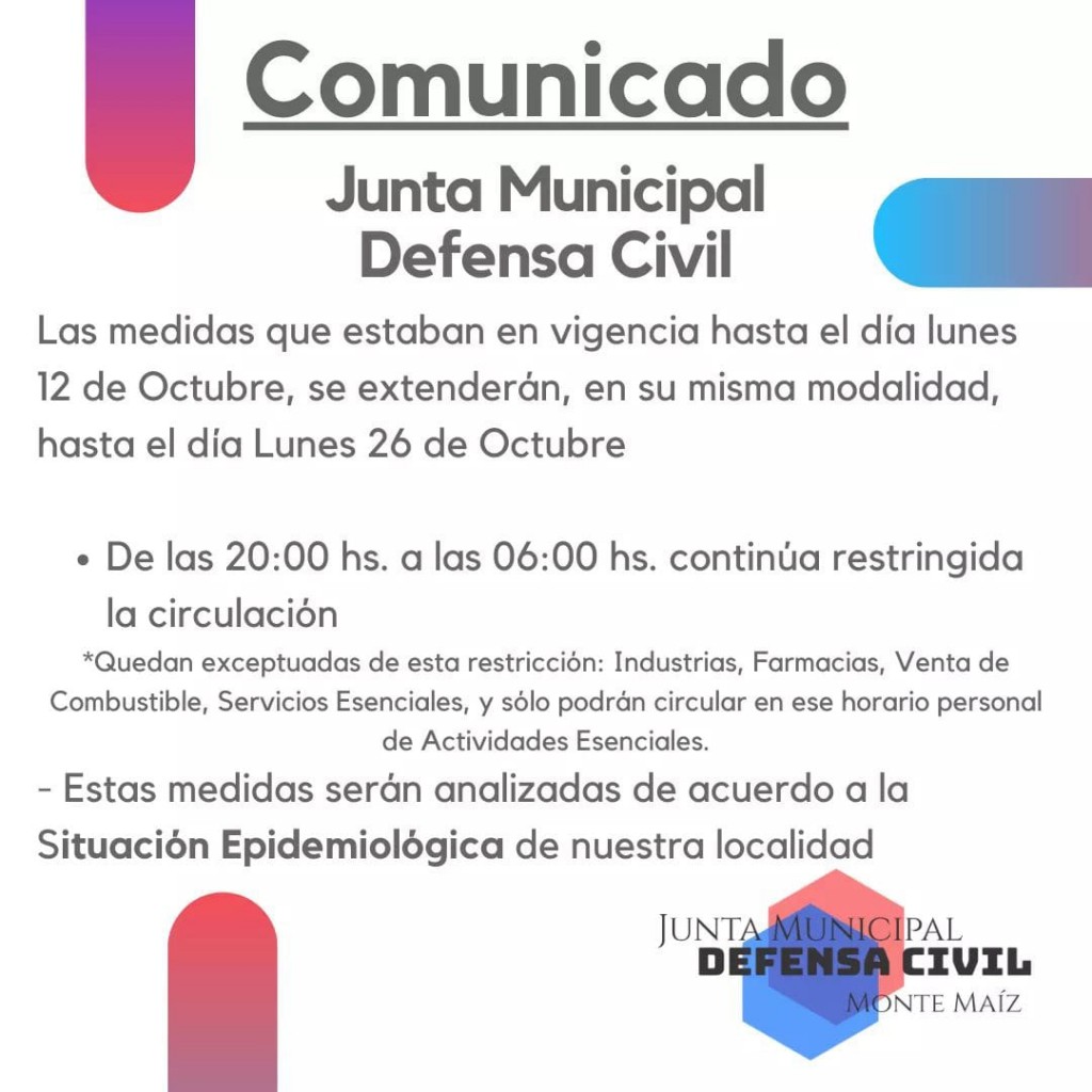 La Junta Municipal de Defensa Civil informó el domingo que las medidas que estaban en vigencia hasta el lunes 12 de octubre se extenderán en su misma modalidad hasta el día lunes 26 de octubre.