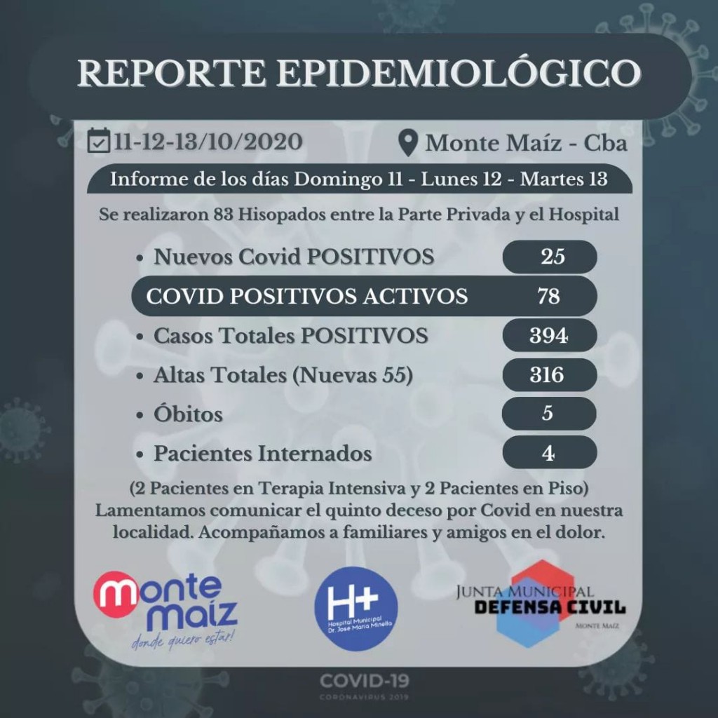 En total, se contabilizan 394 casos de coronavirus desde el comienzo de la pandemia. De ellos, 78 son casos activos, 316 se recuperaron y 5 fallecieron. Uno de los pacientes falleció en la tarde del martes. Se trata de una mujer que estaba internada en el Hospital Municipal y que era hermana de un caso Positivo que también falleció días atrás.