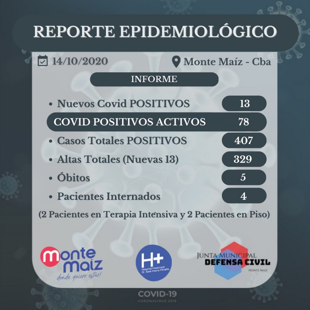 Desde e Hospital Municipal informaron 13 casos nuevos de COVID-19 en Monte Maíz. El número total de casos desde el inicio de la pandemia asciende a 407. De ellos, 78 son activos y 329 ya fueron dados de alta. Hay 4 pacientes internados: 2 en terapia intensiva y 2 en piso. 5 es el total de personas fallecidas a causa de la enfermedad.