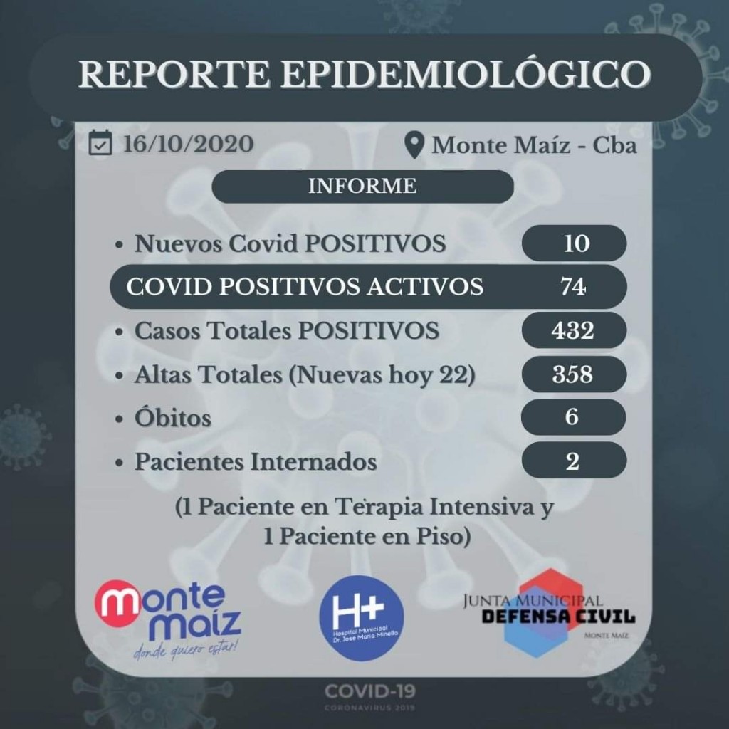 El informe epidemiológico emitido por el Hospital Municipal indicó 10 casos nuevos de COVID-19. A la fecha suman 432 los casos de coronavirus en Monte Maíz; de los cuales 74 son casos activos y 358 han superado la enfermedad.