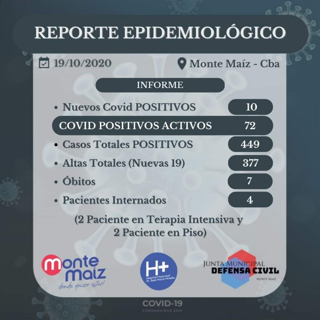 En el día de ayer se confirmaron 10 casos más de COVID-19 Positivos en Monte Maíz. A la fecha se registran 449 casos en total de los cuales 72 son activos, 337 se recuperaron, y 4 pacientes permanecen internados: 2 en terapia intensiva y 2 en piso.