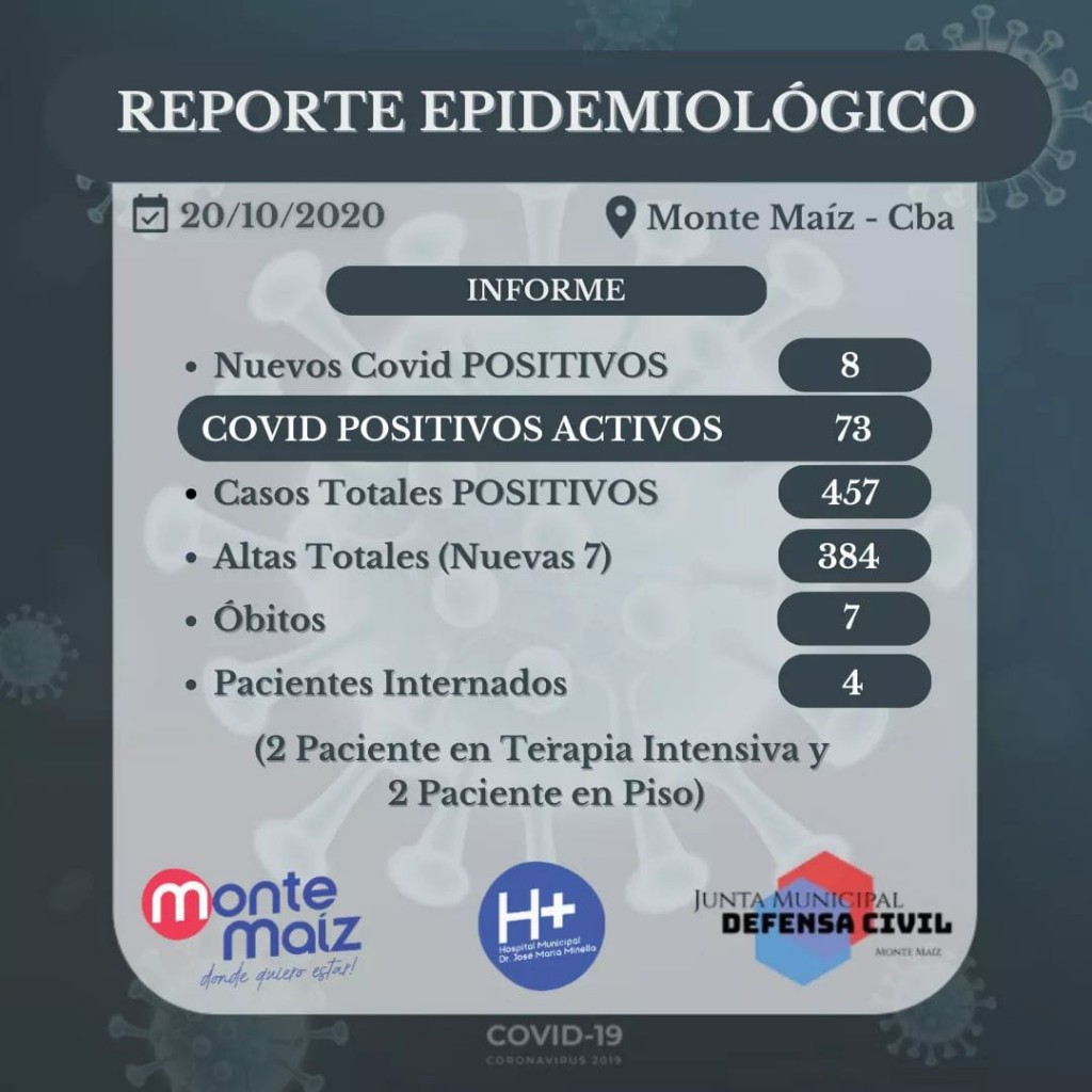 En la tarde de este martes, desde el Hospital Municipal, se informaron 8 nuevos casos de COVID-19 en Monte Maíz. Desde el comienzo de la pandemia a la fecha se registran 457 casos de coronavirus; de los cuales, 78 son activos, 384 se recuperaron y 4 están internados. Hasta el momento fallecieron 7 personas como consecuencia de la enfermedad.