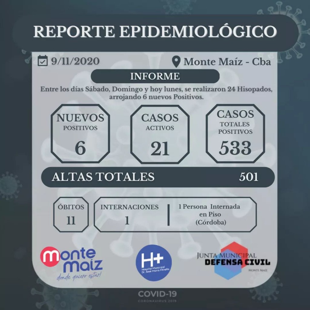En la noche del lunes se informaron 6 casos más de COVID-19 en Monte Maíz. Con lo cual ya se contabilizan 533 casos de coronavirus desde el comienzo de la pandemia. De ellos, 21 son casos activos mientras que 501 personas han superado la enfermedad.