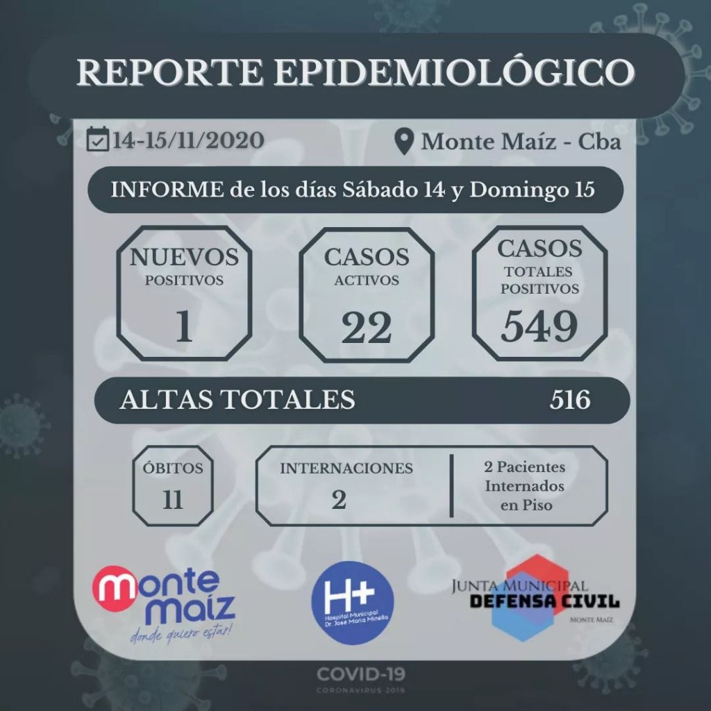 Desde el Hospital Municipal se informó un nuevo caso de COVID-19 en nuestra localidad. De esta manera, se contabilizan 549 casos de coronavirus desde el comienzo de la pandemia. 516 personas superaron la enfermedad, 11 personas fallecieron y 22 son casos activos. Hay 2 pacientes internados en piso.