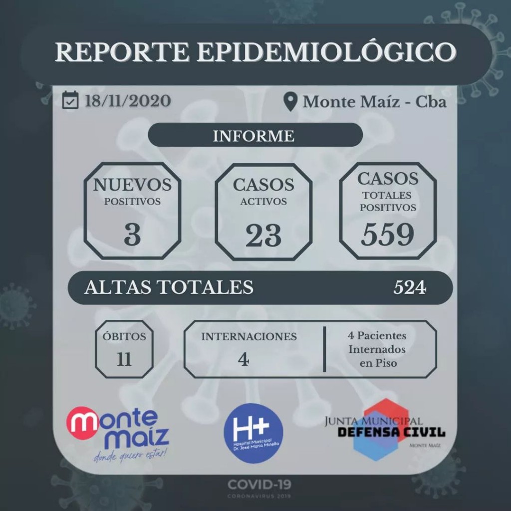 Desde el Hospital Municipal se informaron 3 casos más de COVID-19 en Monte Maíz. De esta manera son ya 559 casos de coronavirus desde el comienzo de la pandemia. De ellos, 524 superaron la enfermedad, 23 son casos activos y 11 personas fallecieron.