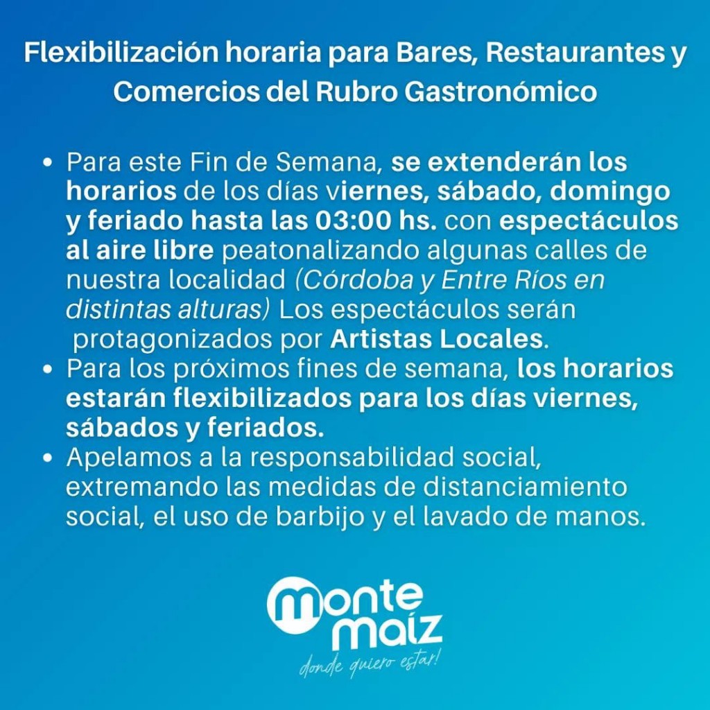 Tal como lo anticipara este medio, desde este fin de semana se extenderá el horario de atención para bares, restaurantes y comercios del rubro gastronómico. Los días viernes, sábados, domingos y feriados el horario se extenderá hasta las 03:00 hs. y se podrán hacer espectáculos al aire libre peatonalizando algunas calles de nuestra localidad (Córdoba y Entre Ríos en distintas alturas). Los espectáculos serán protagonizados por artistas locales.