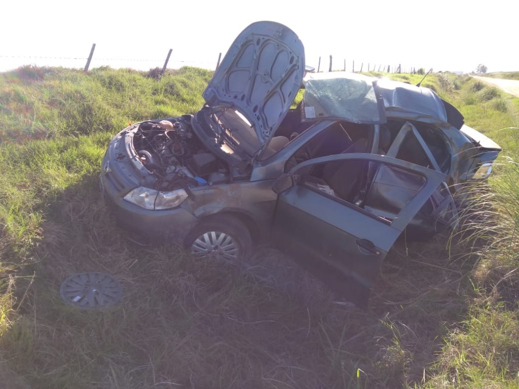 Al arribar al lugar se constató el vuelco en solitario de un automóvil Marca Volckswagen, Modelo Voyage de color gris que se encontraba volcado del lado norte del camino.