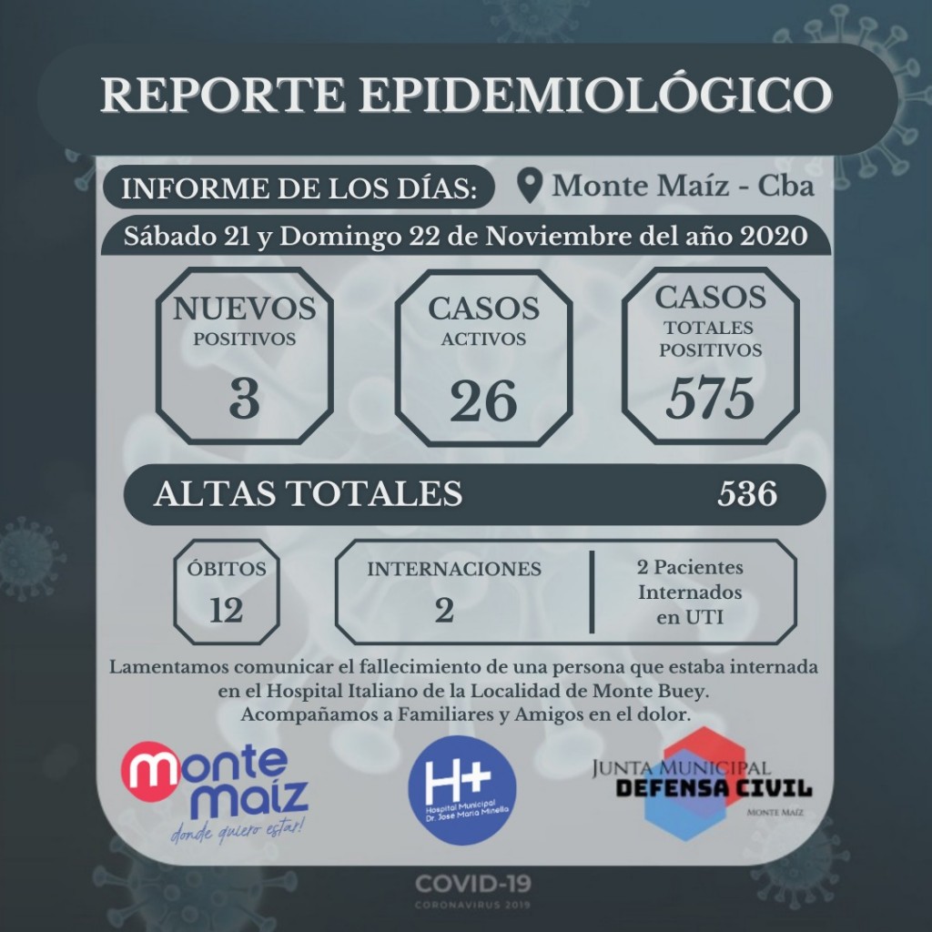 A la fecha se contabilizan 575 casos de coronavirus desde el comienzo de la pandemia. De ellos, 536 se recuperaron, hay 26 casos activos y 12 personas fallecieron. Por estas horas hay dos personas internadas en terapia intensiva.