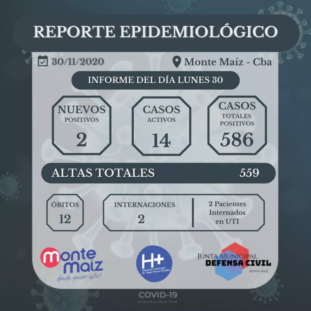 En el informe epidemiológico de ayer el Hospital Municipal informó 2 casos nuevos de COVID-19 en Monte Maíz. De esta manera, ya son 586 casos de coronavirus desde el comienzo de la pandemia. De ellos, 559 han superado la enfermedad, hay 14 casos activos y 12 personas que fallecieron. A la fecha hay 2 pacientes internados en terapia intensiva.