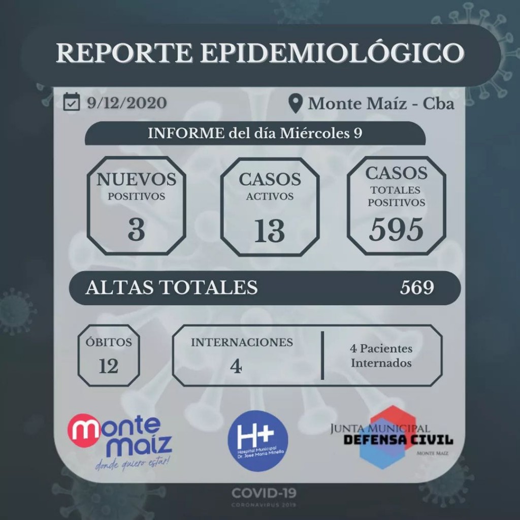 El informe epidemiológico emitido ayer por el Hospital Municipal indicó que desde el 5 al 9 de diciembre se confirmaron 6 casos nuevos de COVID-19 en Monte Maíz. Es así que desde el comienzo de la pandemia se contabilizan 595 casos de coronavirus en nuestra localidad.