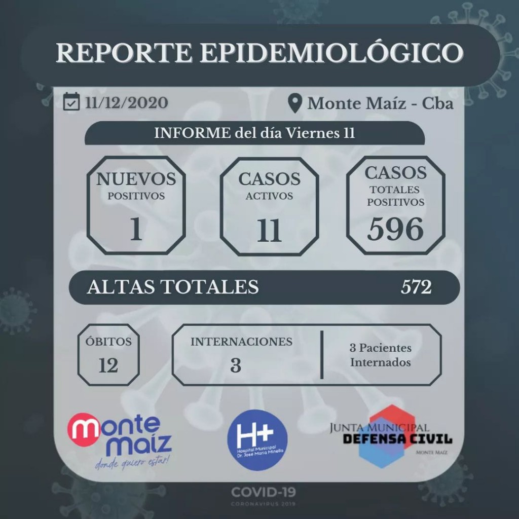 Desde el Hospital Municipal se informó un nuevo caso de COVID-19 en Monte Maíz. A la fecha, se contabilizan 596 casos desde el comienzo de la pandemia. De ellos, 572 personas han superado la enfermedad, hay 11 casos activos, 3 pacientes internados y 12 personas fallecidas.