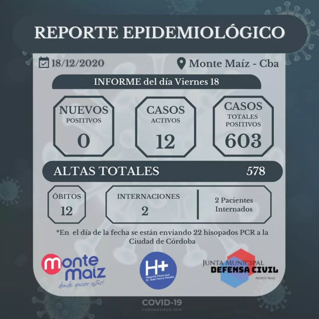 El informe epidemiológico emitido anoche por el Hospital Municipal indicó que hay 12 casos activos de COVID-19 en Monte Maíz aunque no ha habido nuevos contagios en las últimas 24 horas. De esta manera, son 603 los casos de coronavirus en el pueblo desde el comienzo de la pandemia de los cuales 578 son personas que han superado la enfermedad. 12 personas fallecieron y hay 2 pacientes internados en terapia intensiva.