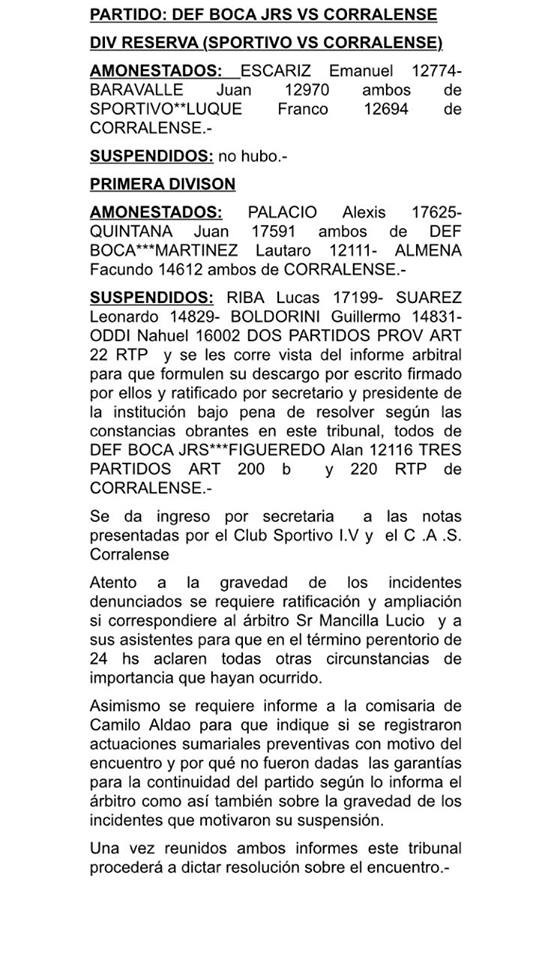 - Pedir informe a la Sub-Comisaría de Camilo Aldao sobre si se registraron actuaciones sumariales, porque no fueron dadas las garantías para la continuidad del encuentro y un detalles de la gravedad de los incidentes.