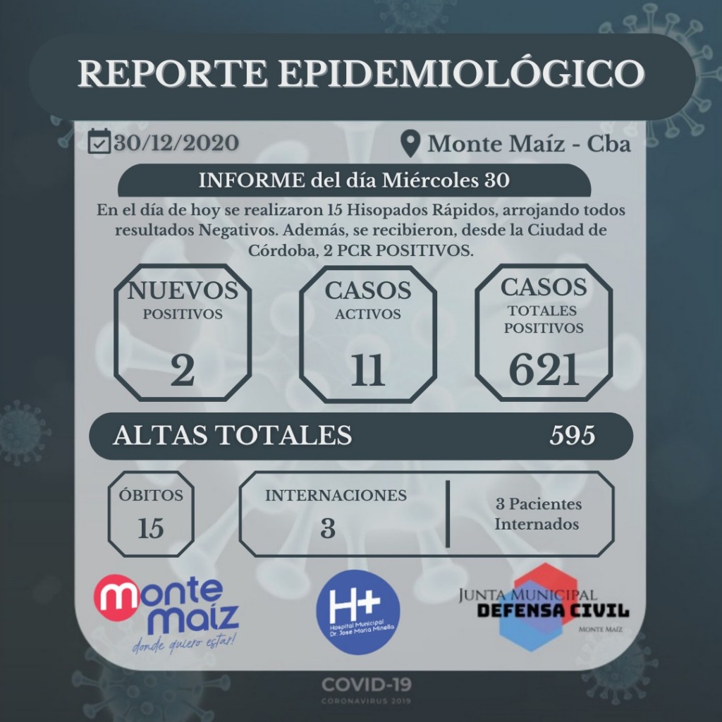Desde el Hospital Municipal, Dr. José María Minella se informaron 2 casos más de COVID-19 en Monte Maíz. De esta manera, se registran 621 casos desde el comienzo de la pandemia.