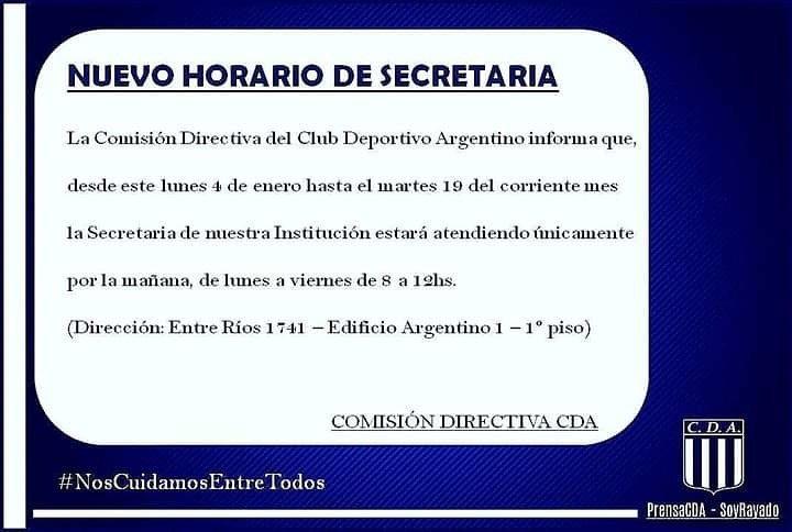 La Comisión Directiva del Club Deportivo Argentino informa que desde el lunes 4 de enero hasta el martes 19, la Secretaría de la institución estará atendiendo solo por la mañana. De lunes a viernes de 08:00 a 12:00 hs. En su habitual dirección, Entre Ríos 1741, Edificio Argentino I, ¡° Piso.