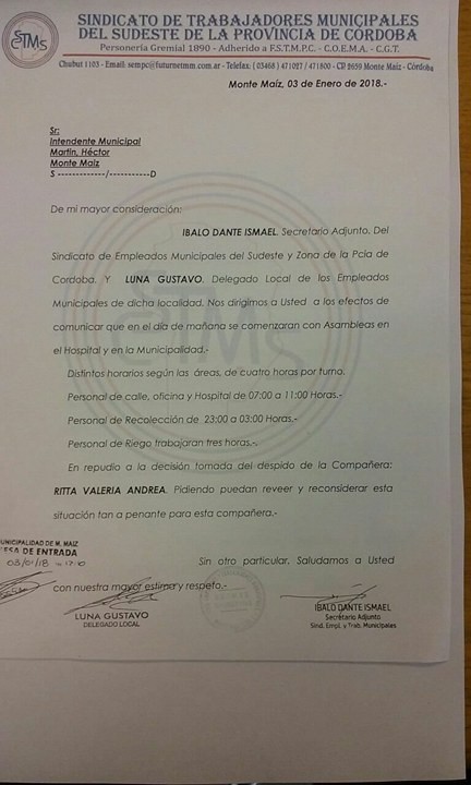 En el mediodía del miércoles el Sindicato de Empleados Municipales del Sudeste Cordobés envió una nota (Foto) al Ejecutivo Municipal dirigida al Intendente Cacho Martín informándole que el día jueves 04 de diciembre comenzarán las Asambleas de cuatro horas por turnos, según las áreas, en el Hospital y en la Municipalidad. Esto, repudio al despido de la trabajadora y pidiendo por su reincorporación: Personal de calle, oficinas y Hospital de 07:00 a 11:00 hs. Personal de Recolección de 23:00 a 03:00 hs. El Personal de riego trabajará solo tres horas. La nota está firmada por Luna, Gustavo, Delegado local y por Íbalo, Dante, Secretario Adjunto.
