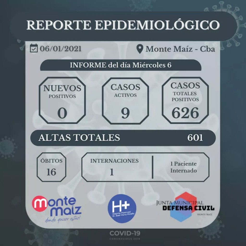 Según el informe epidemiológico del Hospital Municipal, no se han dado nuevos casos de coronavirus en nuestra localidad en las últimas horas. Con lo cual sigue habiendo 10 casos activos en Monte Máiz. Hay un paciente internado en terapia intensiva.