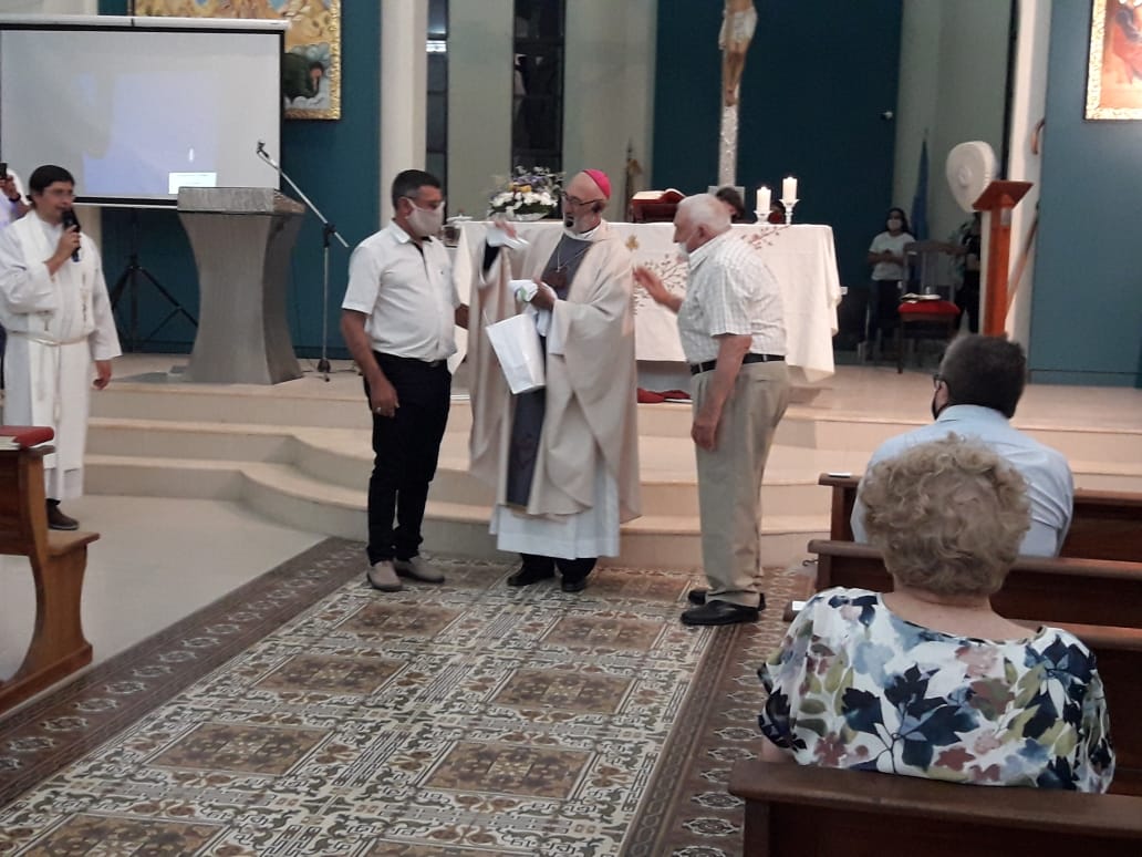 Durante la celebración de las 20:00 hs. los distintos grupos religiosos que se conformaron durante su paso por la Parroquia local le hicieron entrega de presentes que el Padre Roberto recibió con agradecimiento y emoción. Al finalizar la Misa se tomó un tiempo para cruzarse a la plaza en donde saludó a mucha gente y se fotografió junto a ellos. Más tarde, junto al Padre Martín Simonassi y autoridades locales, se decubrió un placa en homenaje a su paso por el pueblo.