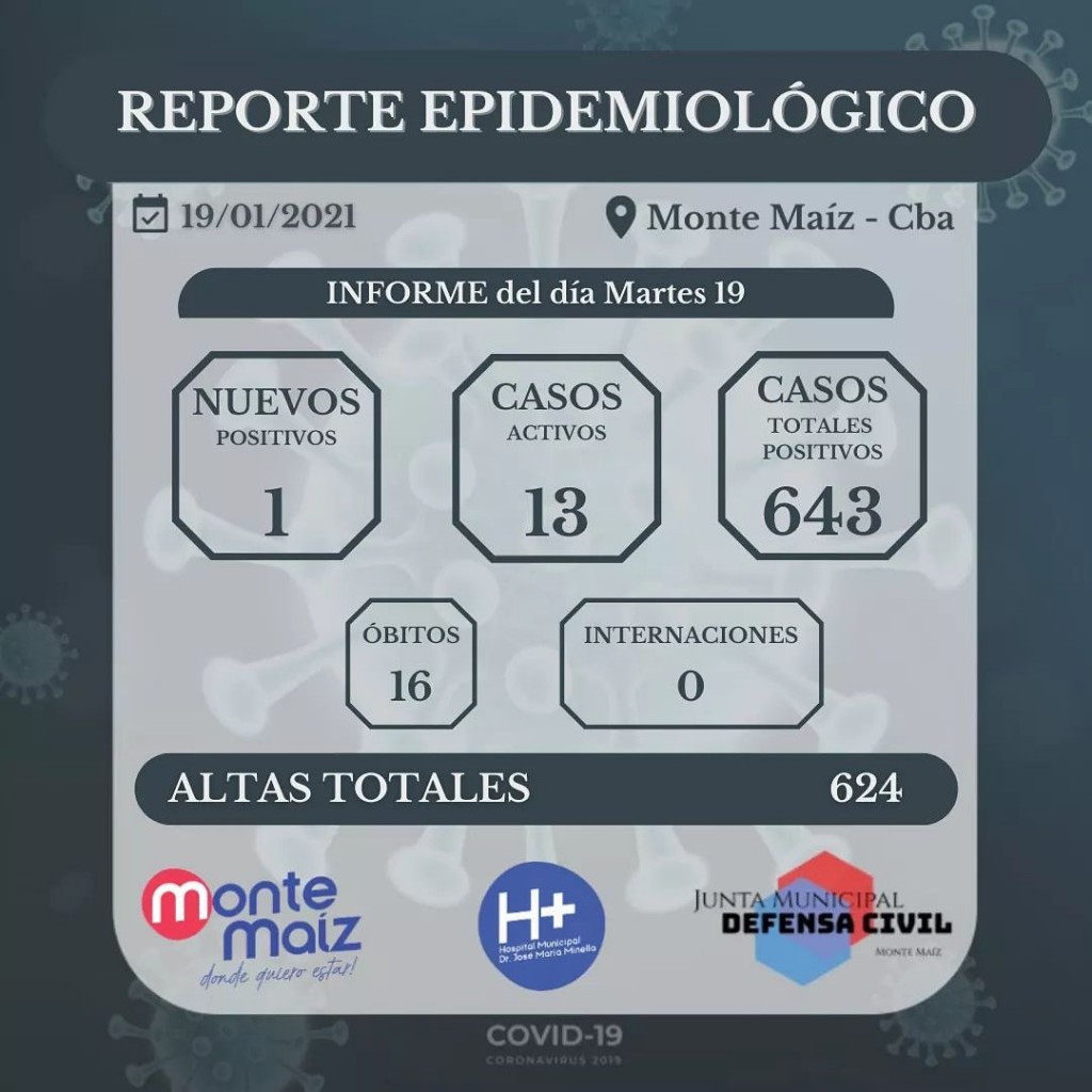 El informe epidemiológico emitido este mediodía por elHospital Municipal confirmó un nuevo caso de COVID-10 en Monte Maíz. De esta manera se contabilizan 643 casos de coronavirus desde el comienzo de la pandemia.