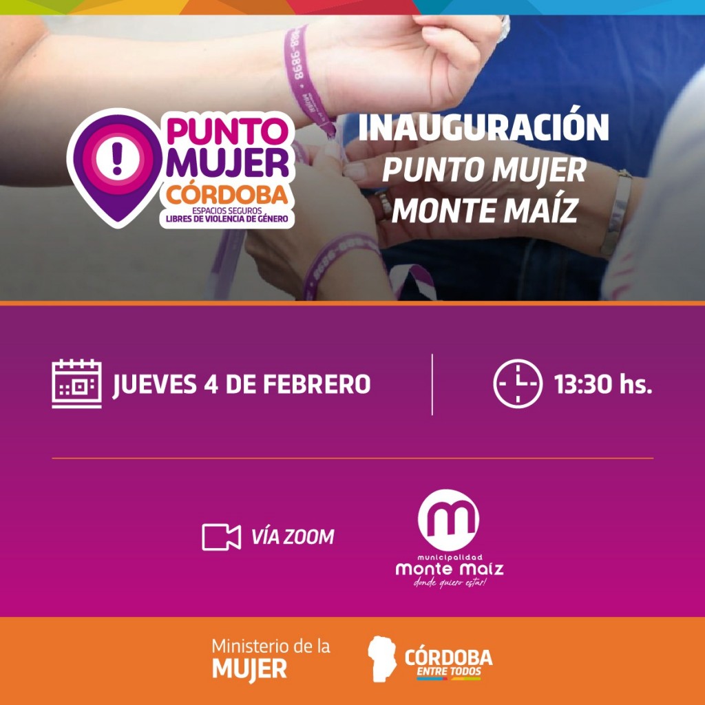 Hoy, a las 13:30 hs. se inaugurará el “Punto Mujer” en Monte Maíz. Tal acto no será presencial sino que será vía Zoom.