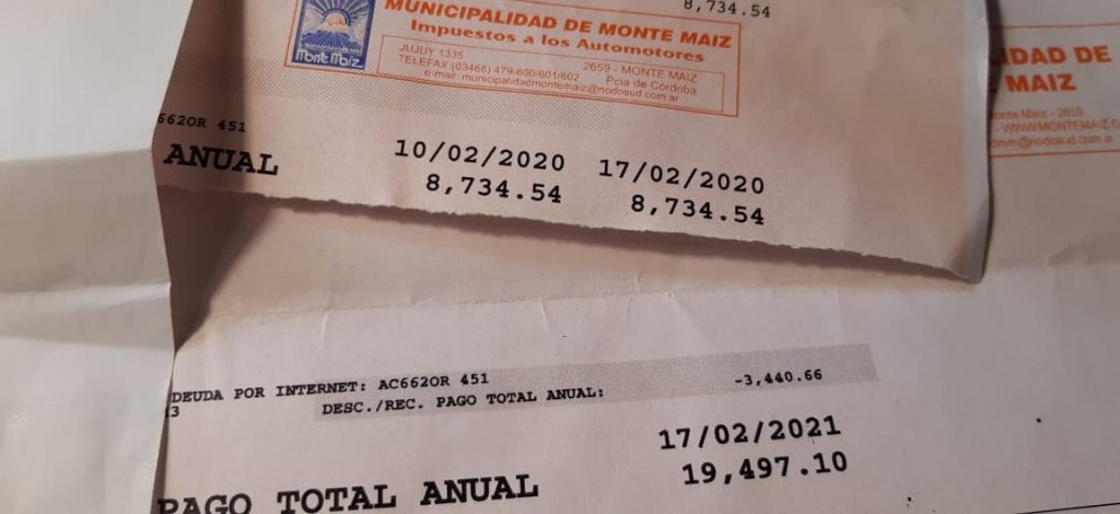 Un vecino de Monte Maíz manifestó su indignación ante el aumento del impuesto automotor comparándolo con el del año 2020.