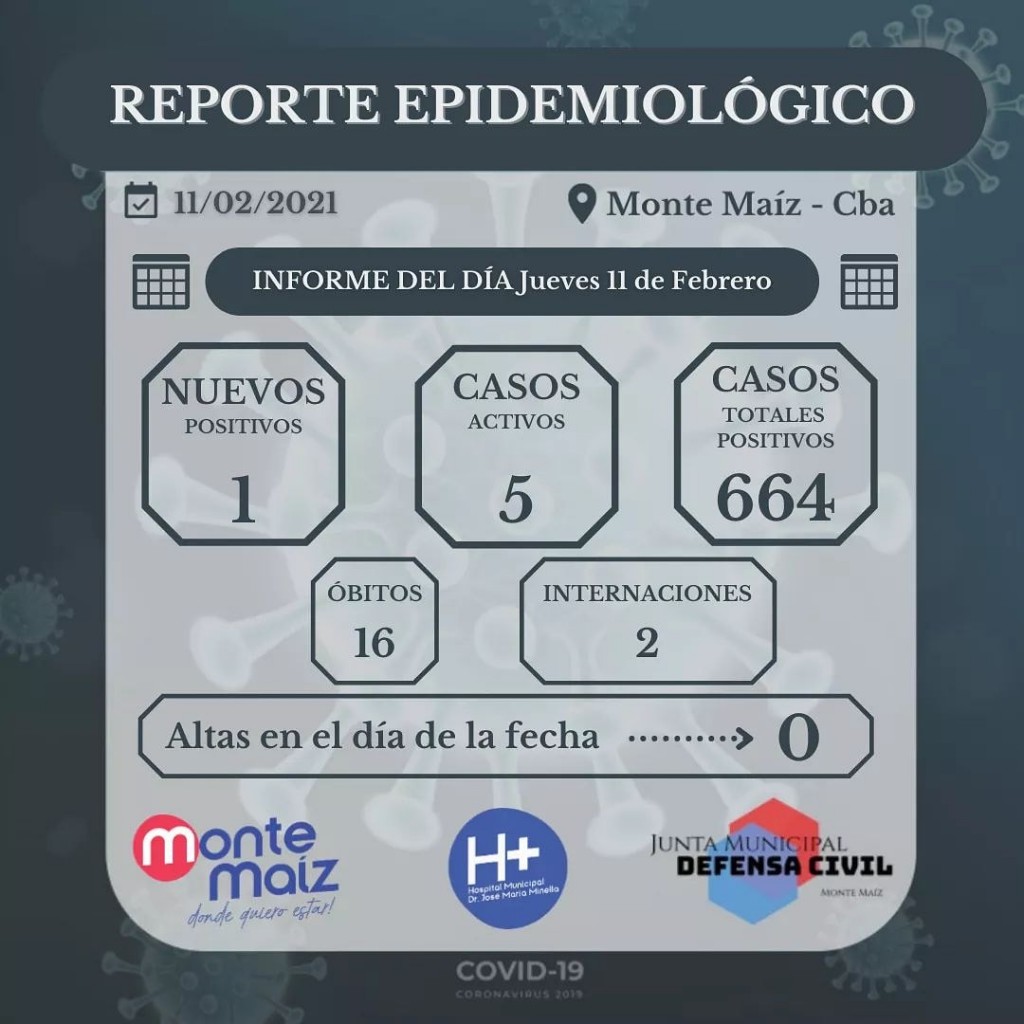 El Informe epidemiológico emitido ayer por el Hospital Municipal confirmó un nuevo caso de COVID-19 en Monte Maíz. De esta manera, se contabilizan 664 casos desde el comienzo de la pandemia.