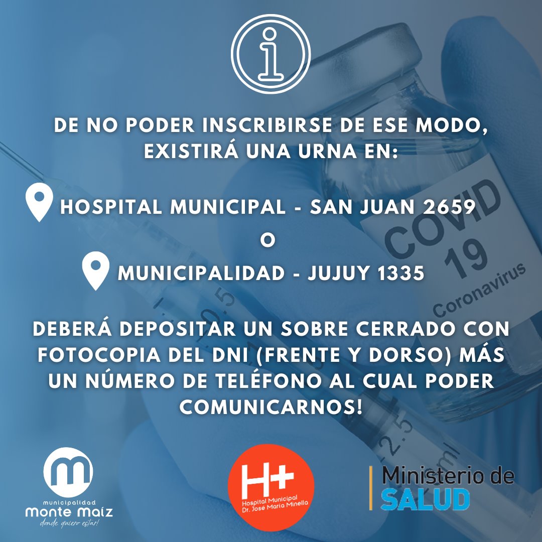 En caso de no poder inscribirse de esa manera habrá una urna en el Hospital (calle San Juan 2659) y otra en la Municipalidad (calle Jujuy 1335). En ellas se deberá depositar un sobre cerrado con fotocopia del DNI (frente y dorso) más un número de teléfono al cual puedan llamarlo.
