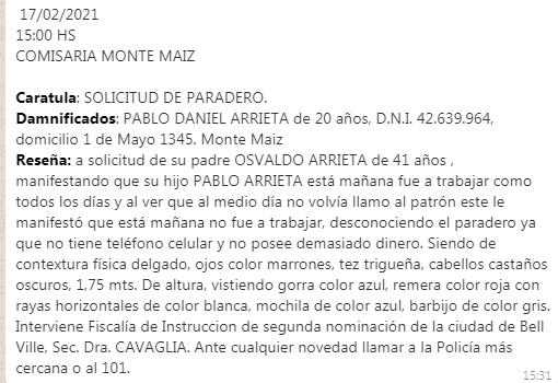 La esposa del joven, Suyay Luz Carranza, expresó a nuestro Medio que en horas del mediodía habría sido visto en la localidad de Pascanas. Aunque ese es un dato que las autoridades no han podido confirmar hasta el momento. Según datos aportados nuevamente por la esposa de Arrieta se estaría investigando si el joven se encuentra aún en Pascanas o pudo continuar viaje hacia Chazón.