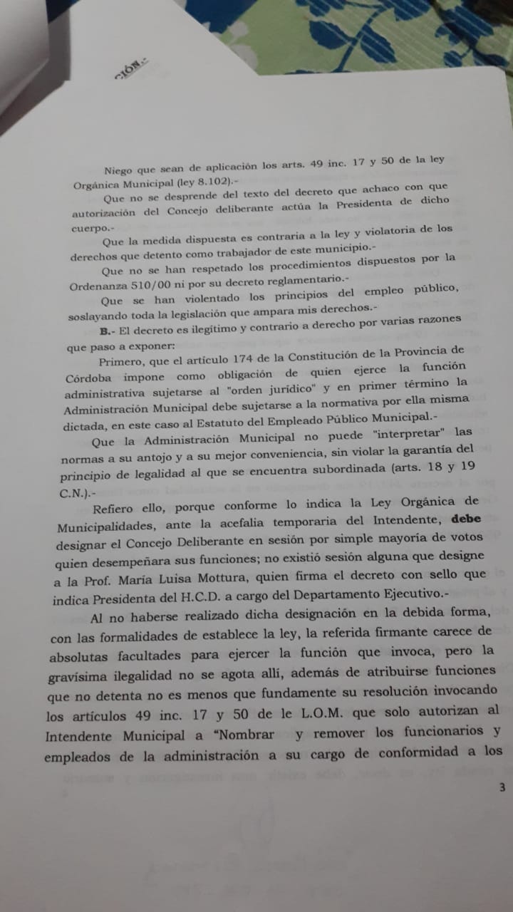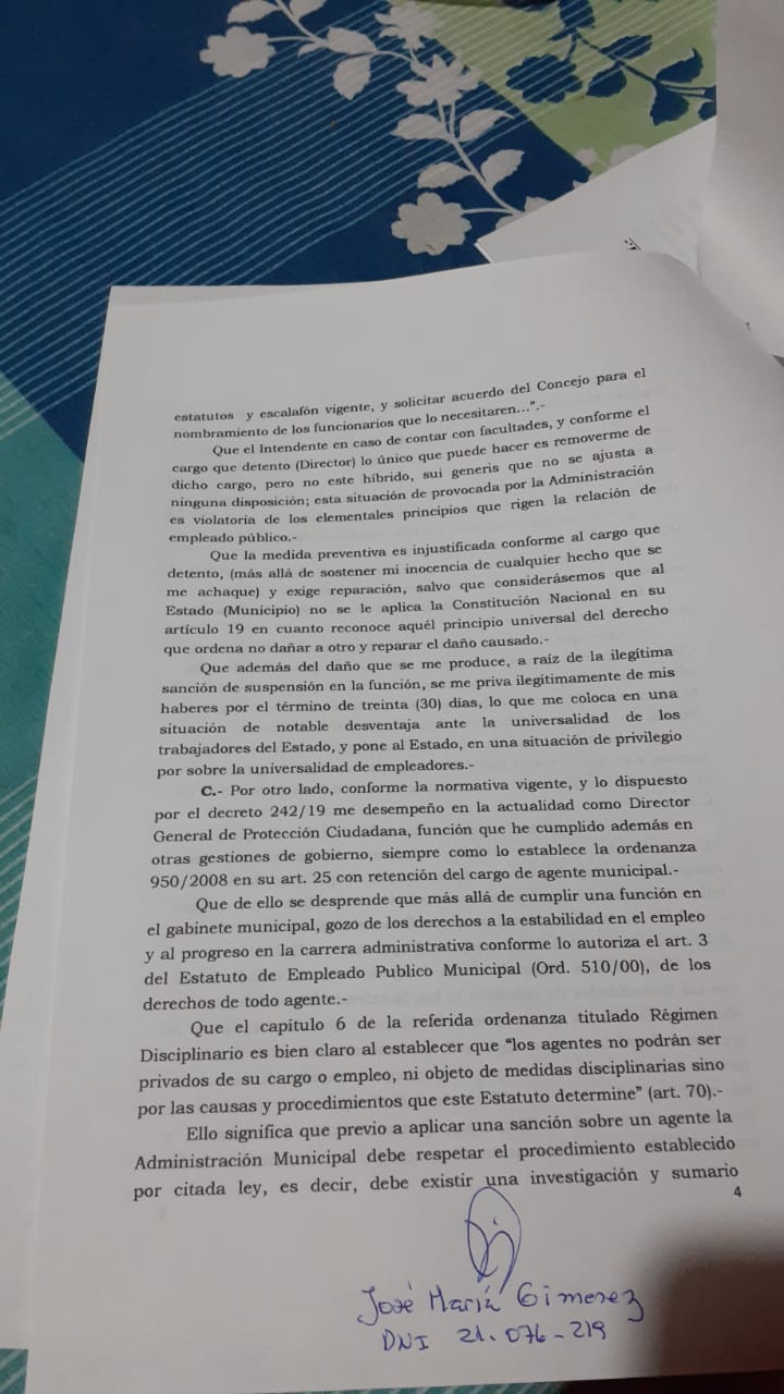 La nota está firmada por la Presidente del Concejo Deliberante María Luisa Mottura en calidad de intendente interina por vacaciones del Intendente Luis Trotte. La ley Orgánica Municipal establece que ante la acefalia temporaria de un intendente, es el Concejo Deliberante el órgano que debe designar por simple mayoría de votos, quién desempeñará su cargo mientras dure su licencia, tal cual ocurrió cuando el Intendente Trotte pidió licencia médica por Covid. En este caso de las vacaciones de Trotte, no se realizó dicha asamblea, por lo tanto la firma de la Presidente del Concejo María Luisa Mottura es nula ya que no ostentaba el cargo de intendente interina.