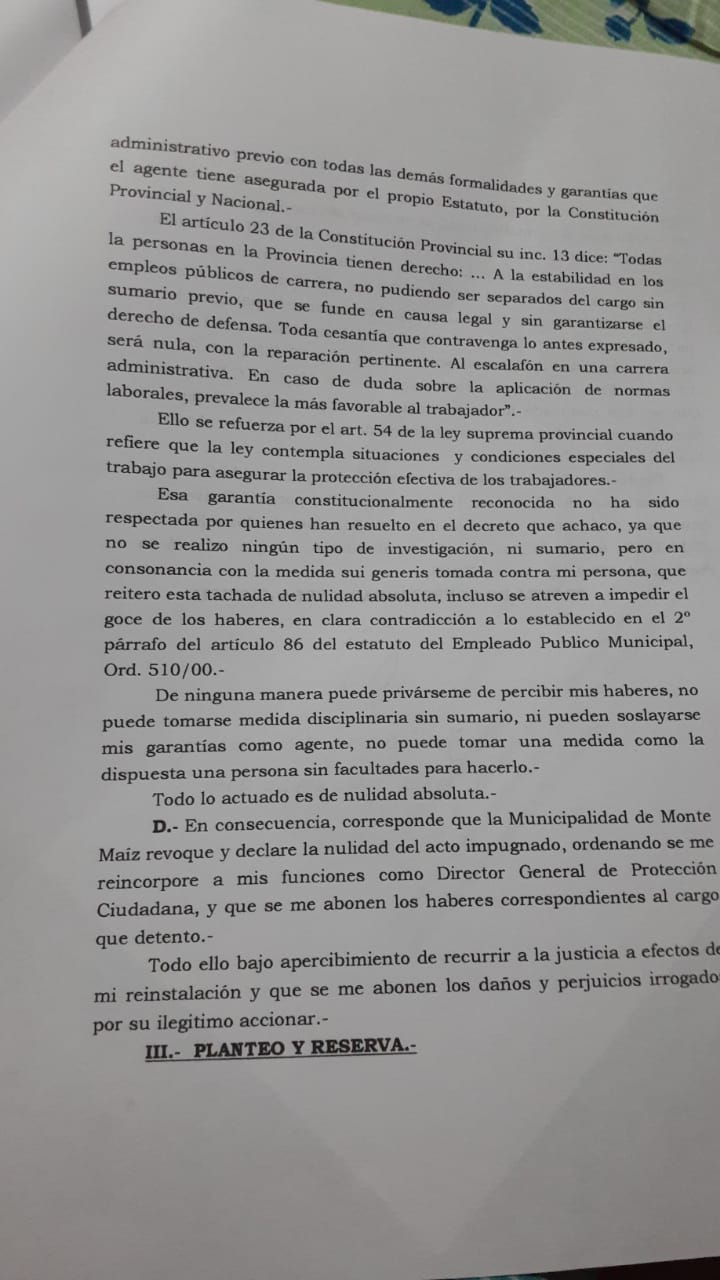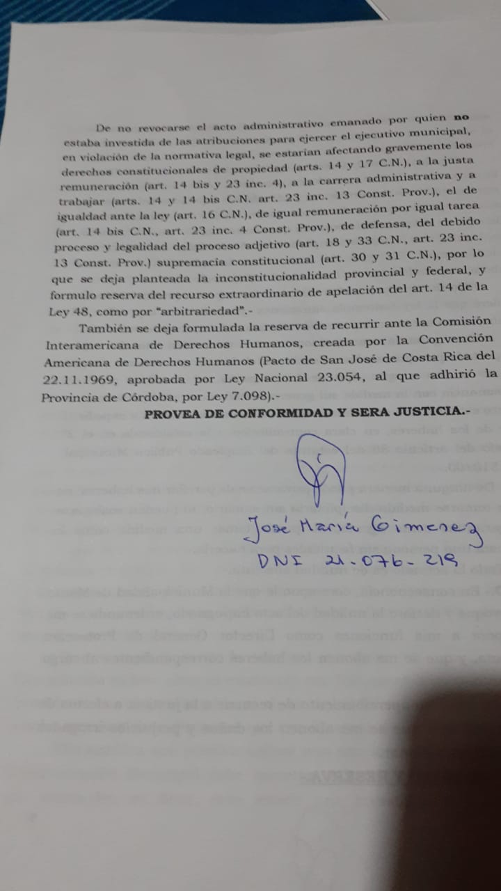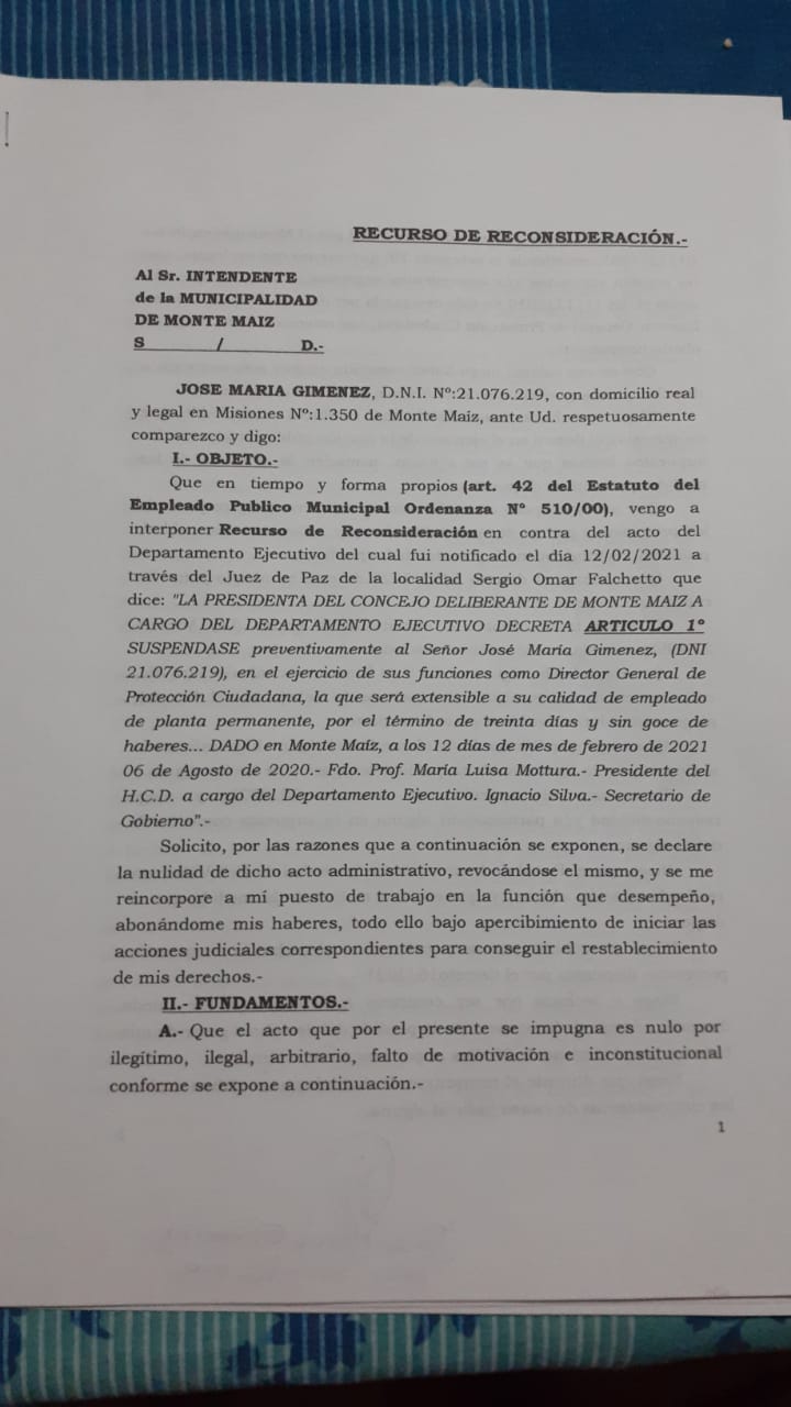 El viernes por la mañana José María Gimenez se llegó hasta la Mesa de Entrada de la Municipalidad de Monte Maíz para presentar el Recurso de Reconsideración (parte del mismo en foto de portada), elaborado por el Estudio Leopoldo Langone y Asociados de Isla Verde, inmediatamente la Dra. Gabriela Soresi, Asesora Letrada del municipio, formuló una denuncia en la Comisaría local porque Gimenez tiene una orden de restricción de acercamiento emanada de Fiscalía de Bell Ville por el término de seis meses, algo absolutamente normal cuando una mujer denuncia abuso o acoso, se trata de restricción de acercamiento por seis meses y no licencia por seis meses, como se ventiló erróneamente en redes sociales.
