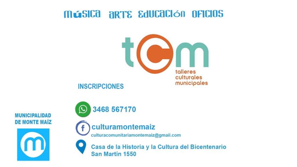 Desde el lunes 1° de marzo comienzan las inscripciones en los talleres Municipales. Arte, música, educación y oficios. Las inscripciones son en la Casa de la Cultura y la Historia del Bicentenario; por correo electrónico a [email protected] o al teléfono: 3468-567170.
